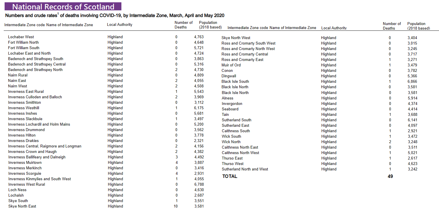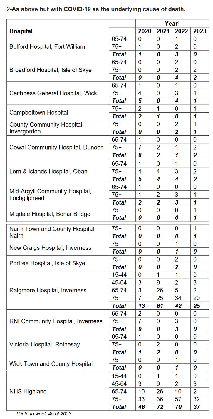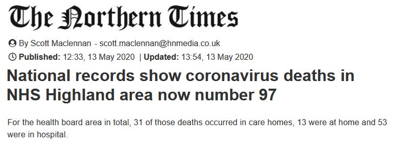 I am therefore at a loss to explain the Northern Times calculation of 53 ‘COVID’ deaths in NHS Highland hospitals deaths in just a few short months??!