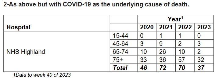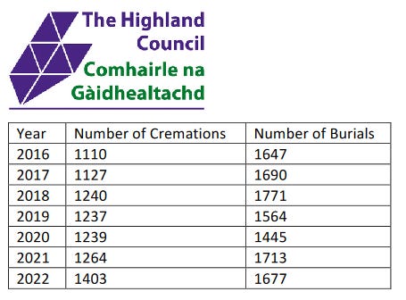 The council released funeral data shows no unusual change in the death rate in 2020 comapred to prior years. Sadly by the end of 2022 there were significantly more cremations than normal driven by NON COVID causes of death. (As can be seen from increases in the death rate at the Raigmore, the regions largest hospital).