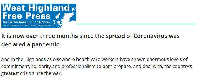 In 2020, just 3 months after the pandemic was declared the West Highland Free Press referred to it as: