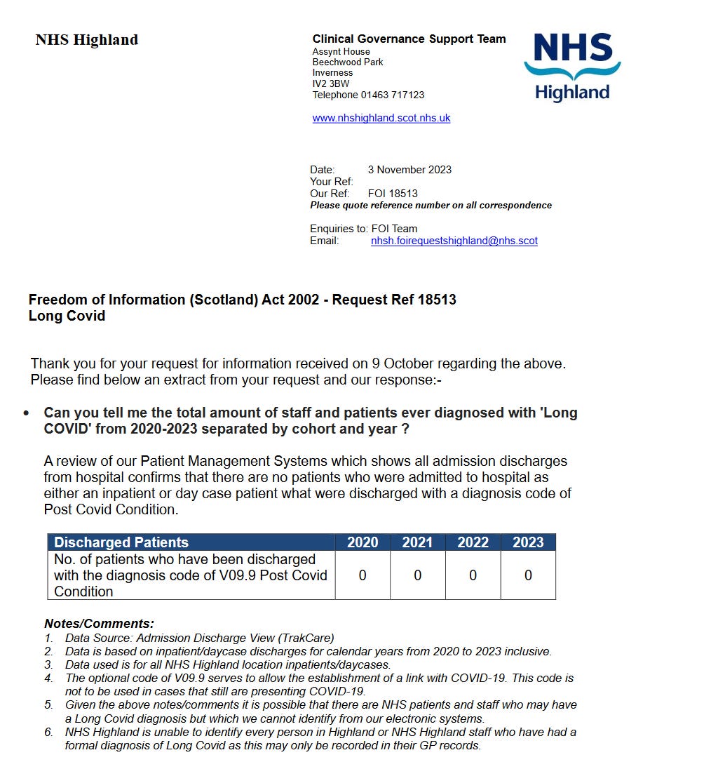 However contrary to media claims the healthboard has acknowledged there has not been a single reported diagnosis of ‘Long COVID’ (aka Post COVID-19 condition) within NHS Highland hospitals in 3 years !