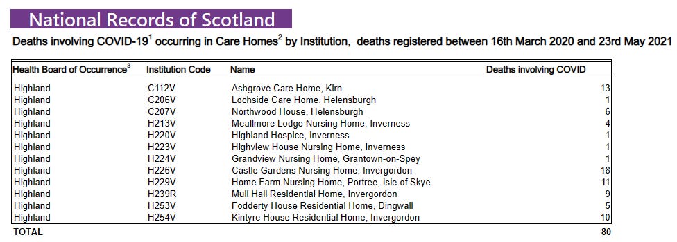 Over 15 months of available care home data for the Highland area shows during the peak of ‘the pandemic’ there were only 80 deaths ‘involving’ the virus. Half of all care homes in the region only registered 5 or less deaths.