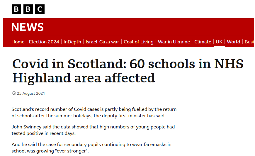 On August 25th 2021 Scotland's record number of Covid cases was said to be partly being fuelled by the return of schools after the summer holidays, the deputy first minister has said. John Swinney said the data showed that high numbers of young people had tested positive in recent days. And he said the case for secondary pupils continuing to wear facemasks in school was growing "ever stronger".