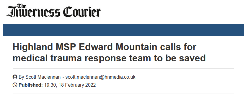 “Lives should not be put at risk by reducing the life-saving PICT service down to four days….This pioneering service is essential when responding to major trauma incidents across the Highlands – we simply cannot afford to lose it.”