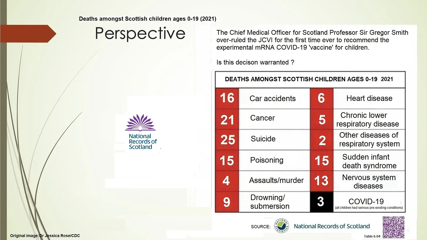 It should be noted that in comparison to these Covid statistics (over three years) from 2020 until the end of 2021 (over just a two-year period), there were tragically 56 deaths from suicide in Scotland in those under under 20 years of age.