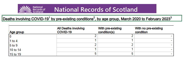 This question was raised in relation to the following data showing no healthy child died ‘involving’ the virus in 3 years. Of those that would be of school age sadly >8 deaths were recorded. However, it is highly likely these were children with serious pre-existing underlying conditions (stage 4 cancer/MS etc) that would prevent them from attending a primary or secondary school. NRS are unable to confirm educational status.