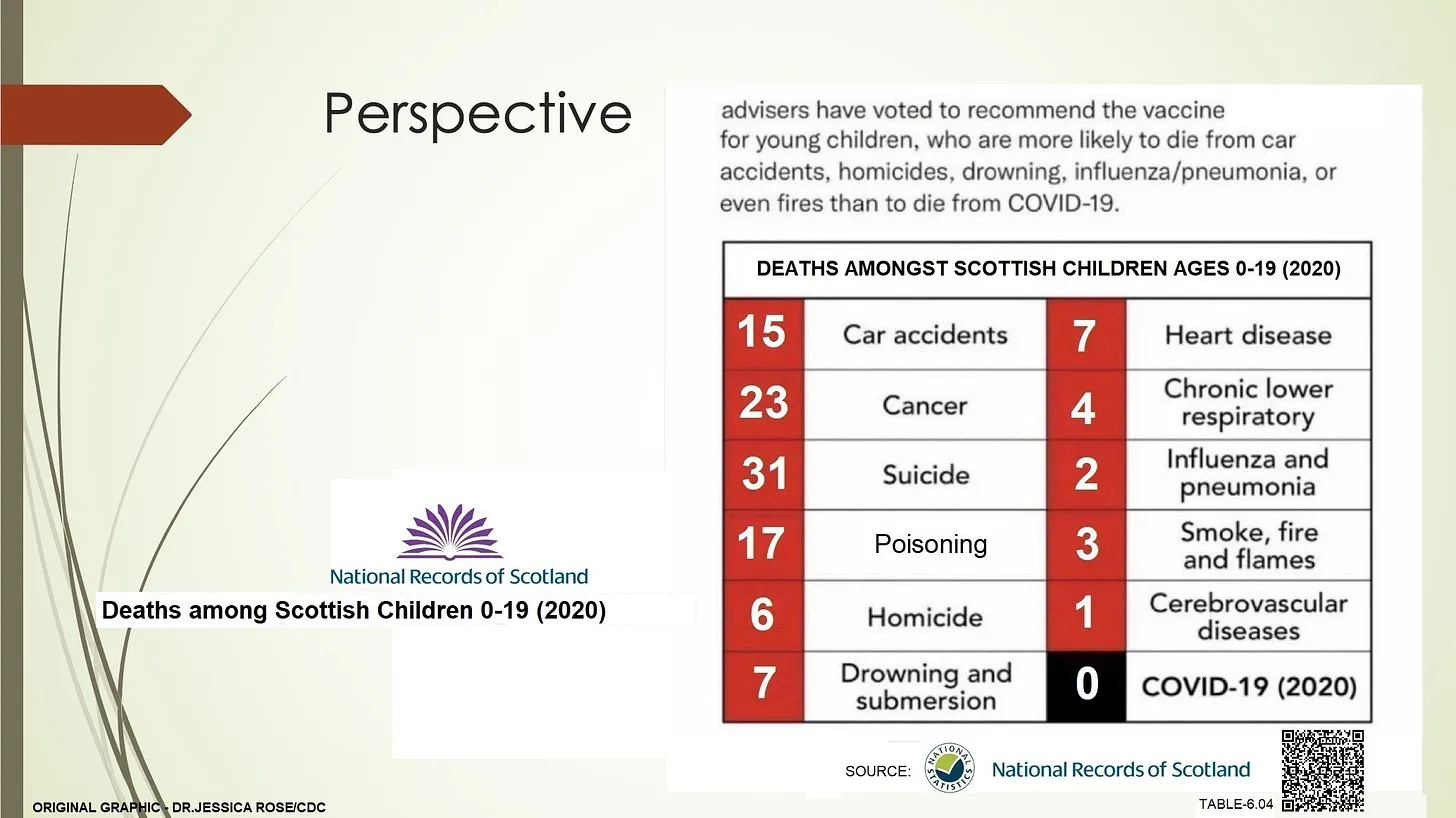 It seems incredible with these statistics politicians and public health experts would then risk the health of future generations with fast tracked experimental mRNA injections given by their own admission the innoculations did not stop transmission.