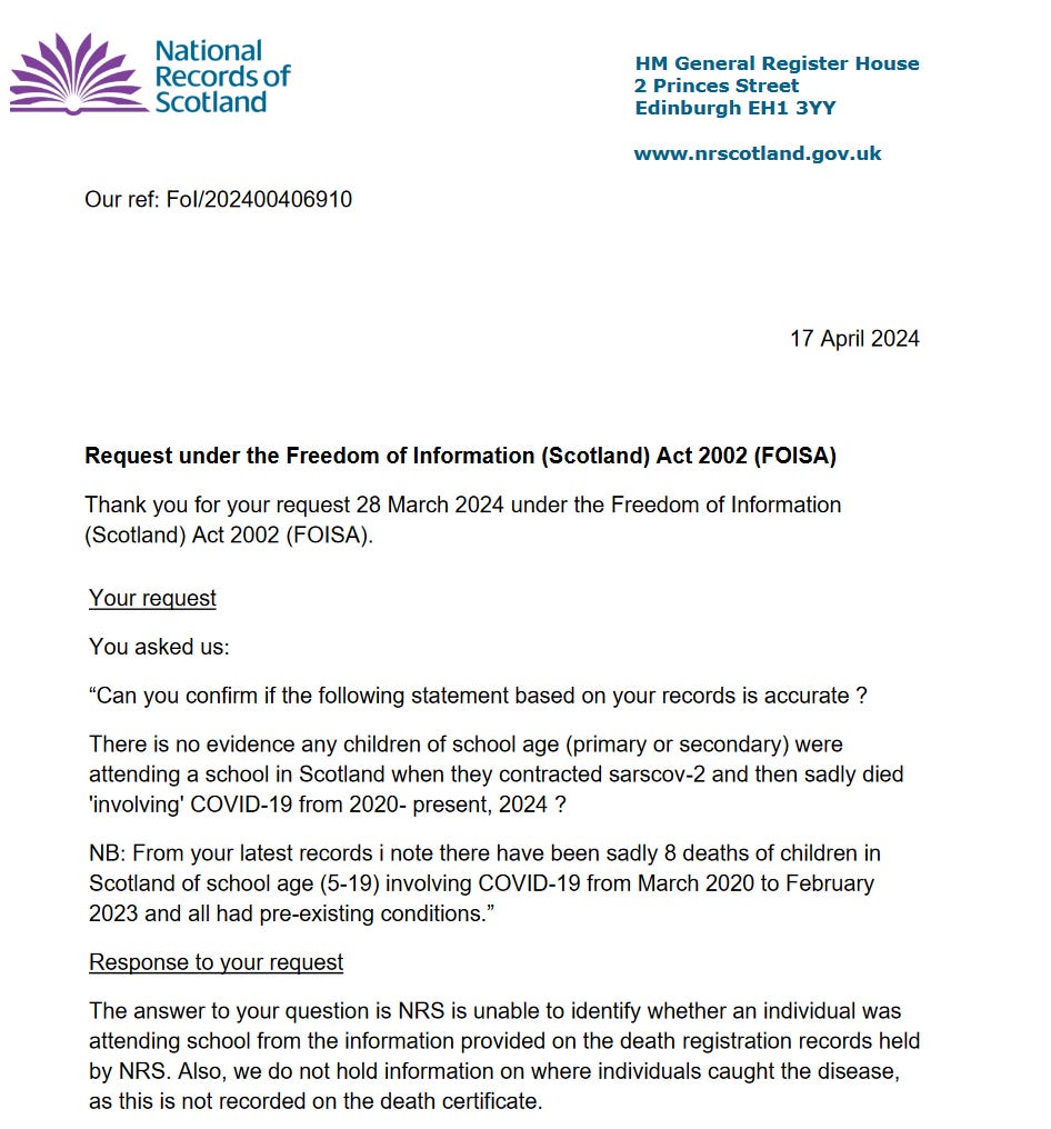 New correspondence from National Records of Scotland confirms there is no evidence ANY child attending a school in Scotland has ever died due to COVID-19 or even caught ‘the virus’ in a school setting.