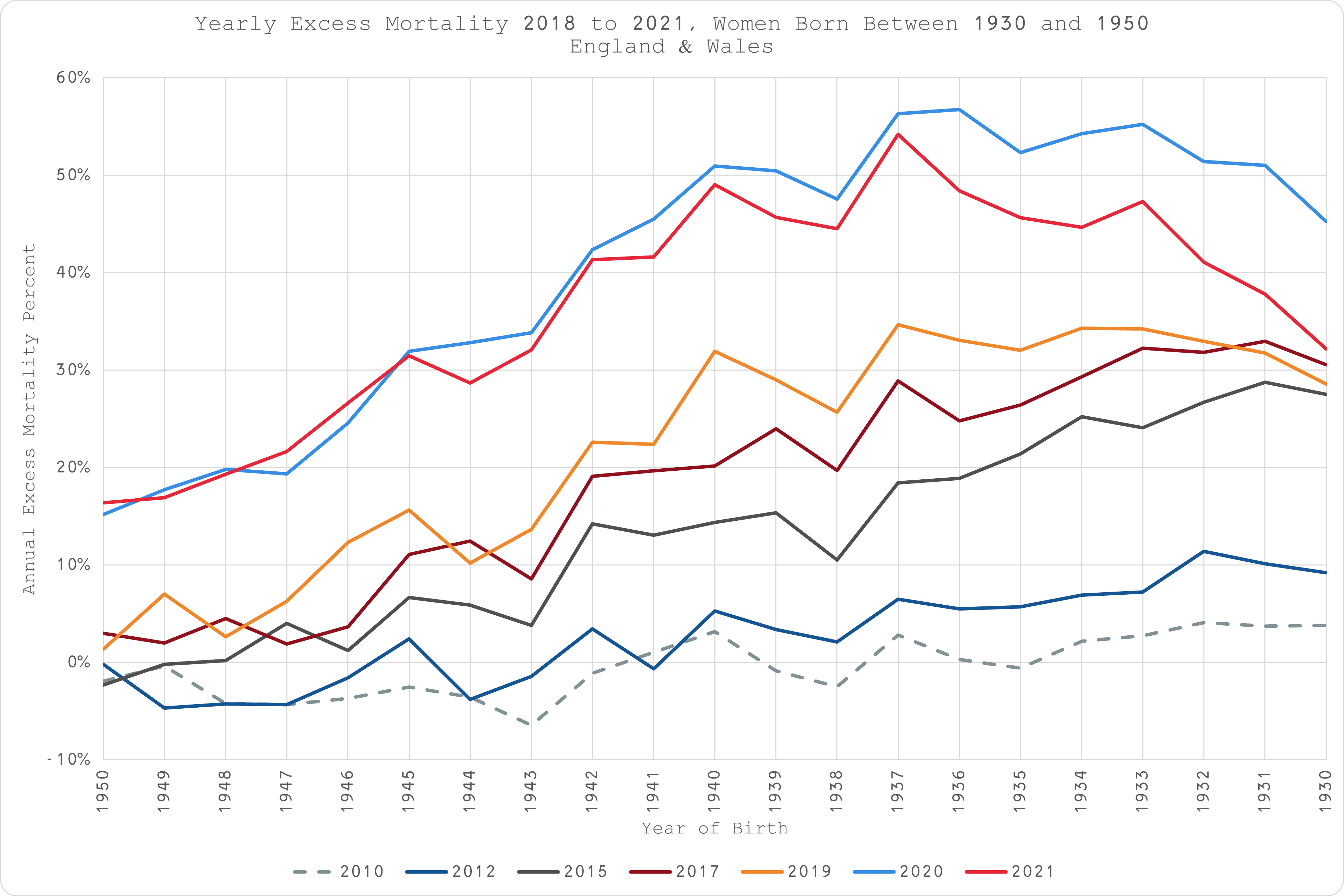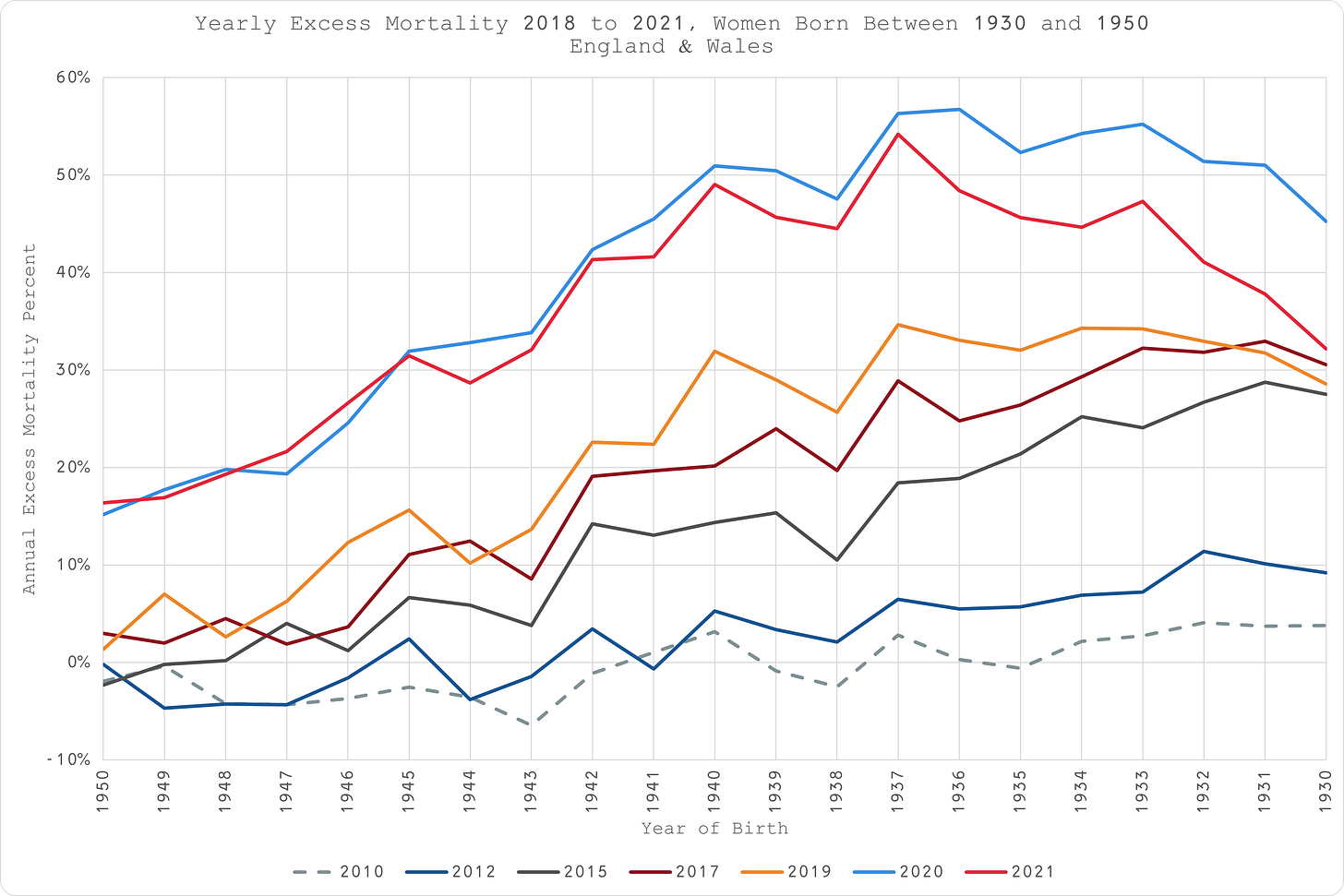 Looking at the annual excess mortality since 2010, it seems apparent that whatever was responsible for the substantial excess mortality in 2020 (the year of “COVID”) and even more so in 2021 (the year of the “COVID” “vaccine”), it was the same thing that has been killing elderly women in the UK for over 20 years, and getting progressively worse each year until the pull-forward effect finally kicks in.