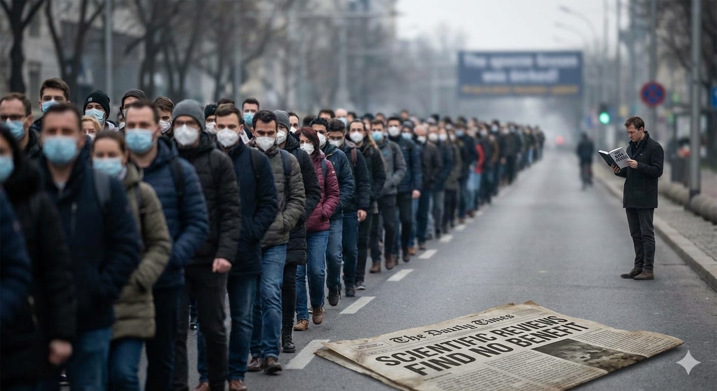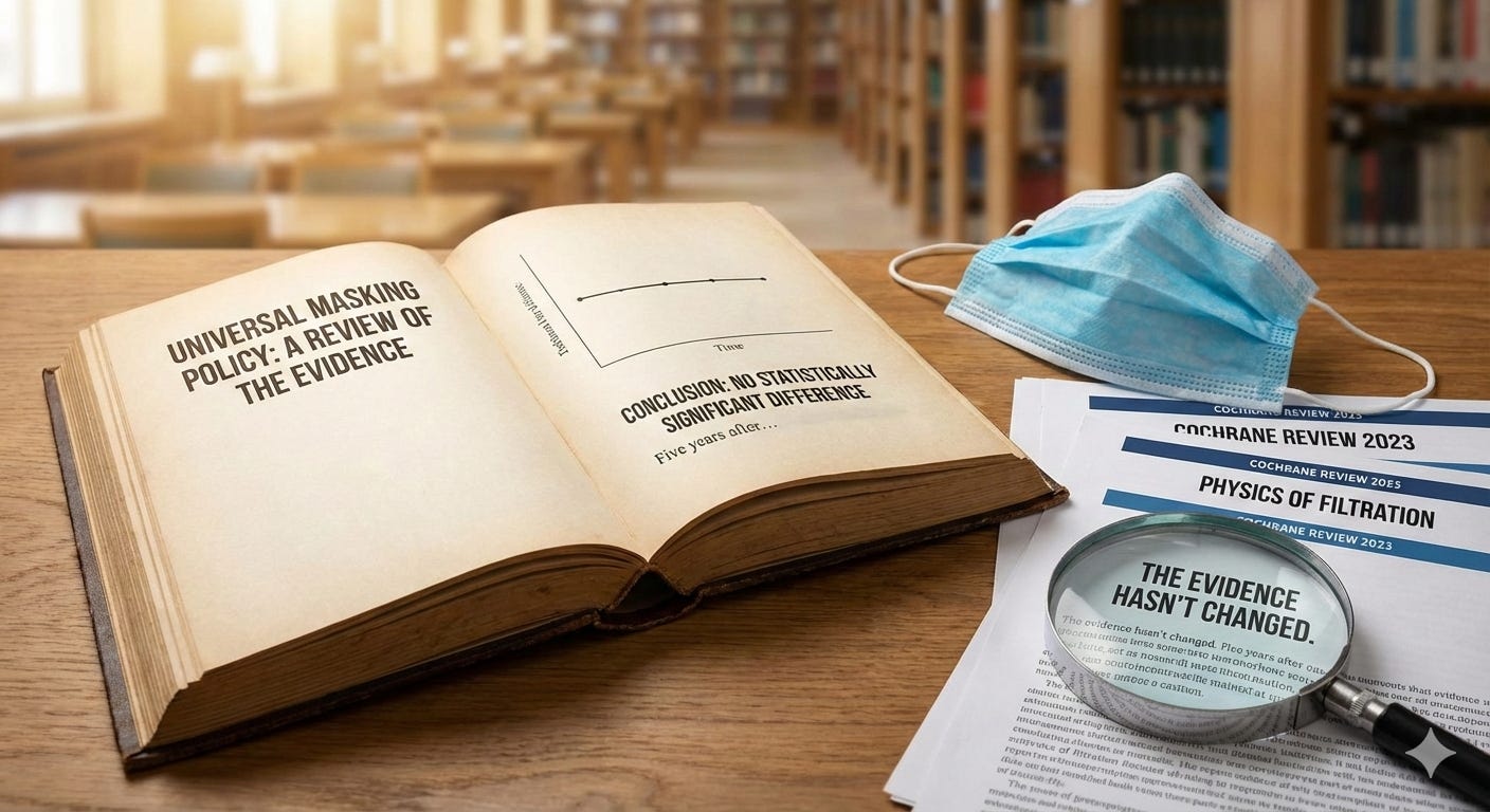What follows is not new research. It’s a reminder of what we already knew - what the authorities themselves knew - before they mandated masks anyway. The randomised controlled trials haven’t changed. The real-world data hasn’t changed. The physics hasn’t changed. The only thing that has changed is that we now have even more evidence confirming what was already clear: universal masking was, and remains, a policy without scientific foundation.